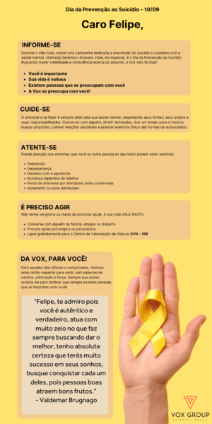 “O foco aqui, além de informá-los em relação aos sintomas, às saídas existentes, como procurar ajuda e sobre a existência do Centro de Valorização da Vida (CVV), era fazer com que eles se sentissem motivados e especiais através das palavras de seus colegas, que por conta da rotina, muitas vezes são elogios e depoimentos deixados de lado.” disse a Assistente de Marketing, dessa forma, pudemos trazer um cartão personalizado a cada um, unindo a informação com o sentimento de pertencimento.